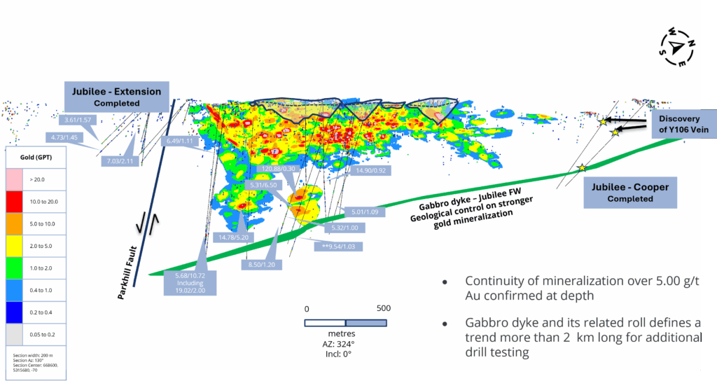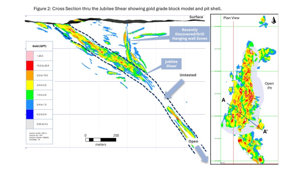 - Expansion of lower grade mineralization located in the hanging wall of the Jubilee Shear and in the northern extension of the Jubilee Shear that would occur within an open pit scenario